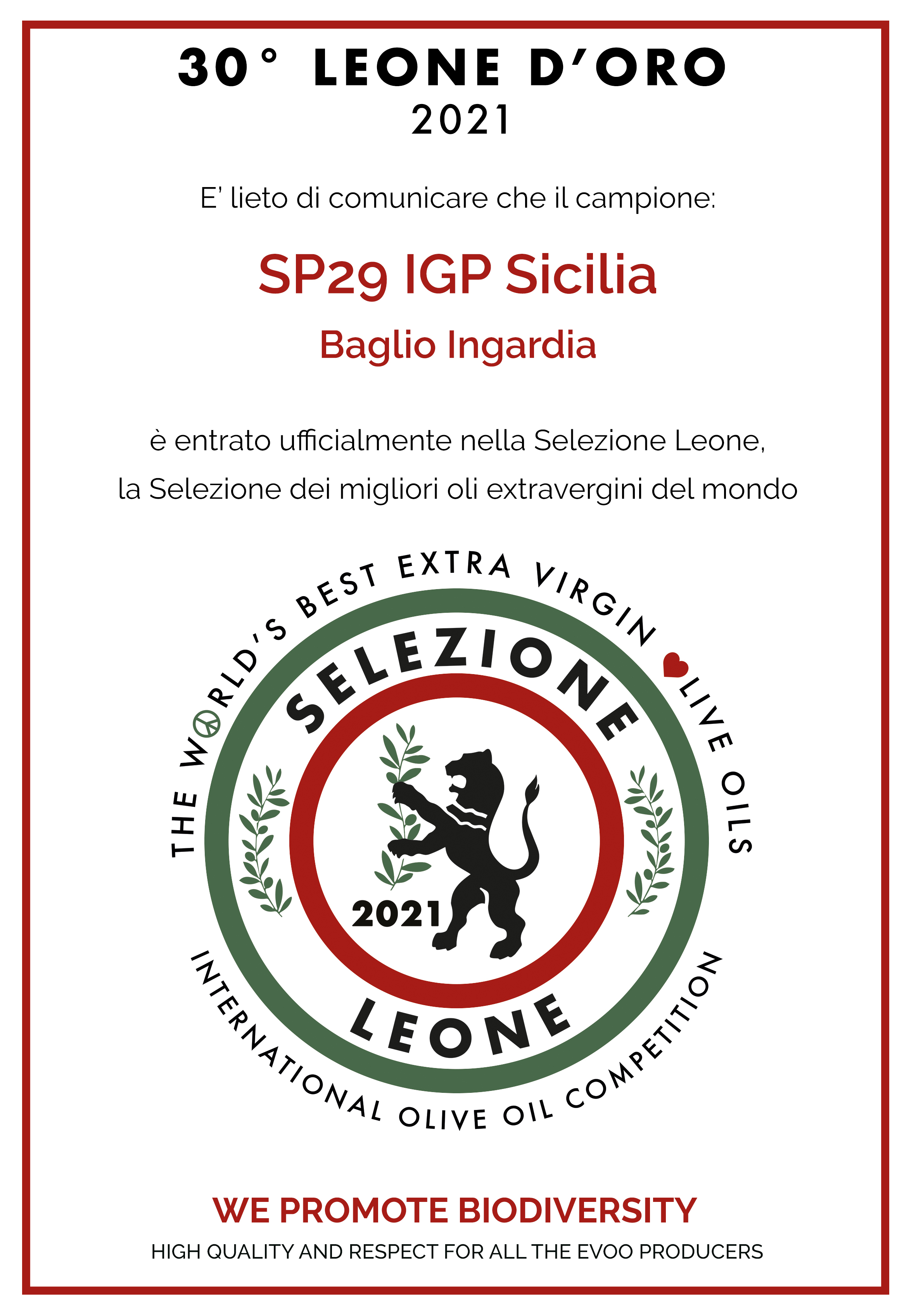 Concorso Leone d'Oro International, Selezionato con punteggio superiore agli 85/100 Olio Extra Vergine di Oliva Biologico "SP 29" Grand Cru IGP Sicilia